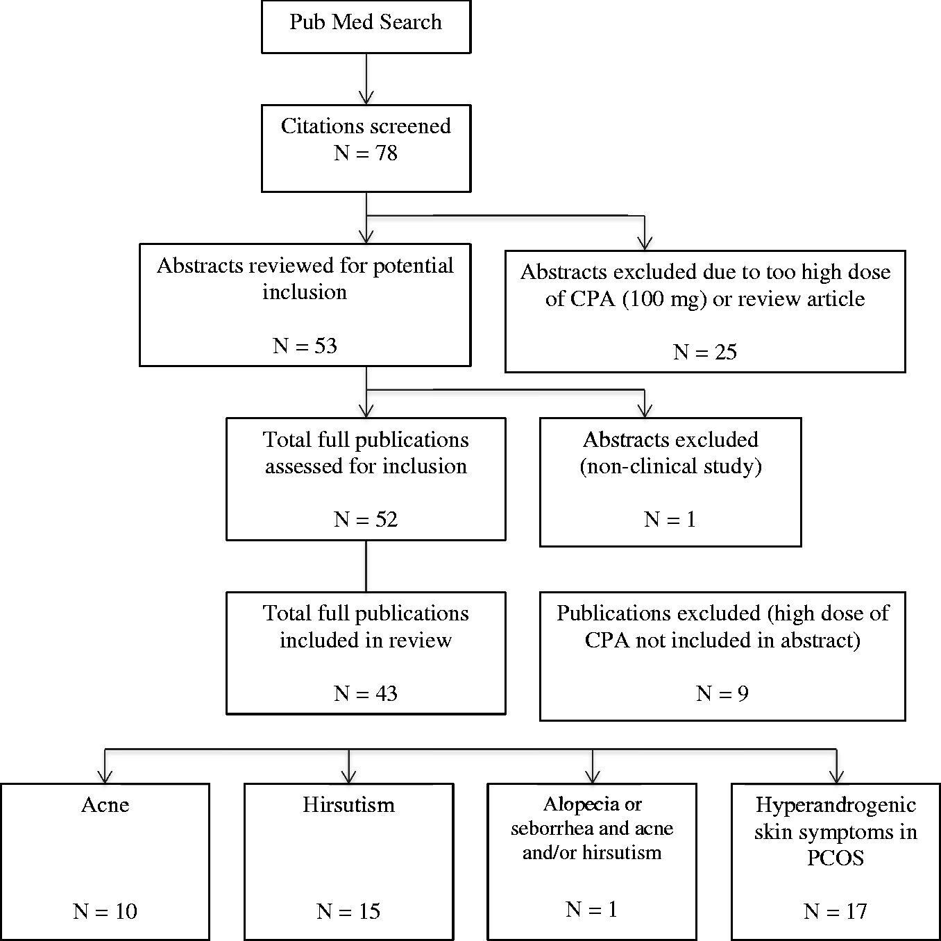 Terdapat 15 studi yang mengevaluasi efikasi CPA/EE pada perempuan dengan hirsutisme (baik idiopatik, maupun sebagai gejala kulit PCOS), dari tahun 1982 hingga 2012. Studi-studi tersebut meliputi empat studi pembanding, dua studi dosis, sembilan studi kombinasi, dan satu studi rejimen sekuensial terbalik.